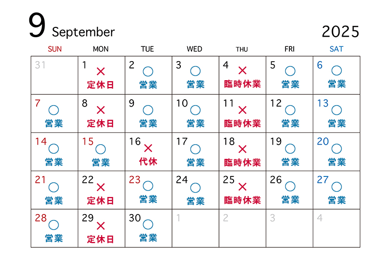 9月の営業日程ご案内 HOME お知らせ9月は下記の日程を臨時休業とさせて頂きます。9月4日 / 11日(木) / 18日(木) / 25日(木)9月の営業日程 なお、9月15日の祝日(月曜日)は通常通り営業。翌日16日(火)を代休とさせて頂きます。宜しくお願い致します!! 2025.08.31 タグ:ご案内 (130) 『いいね!』&『フォロー』 頂けると嬉しいです!! Follow @TrattoriaVeritaPosted By シェフ